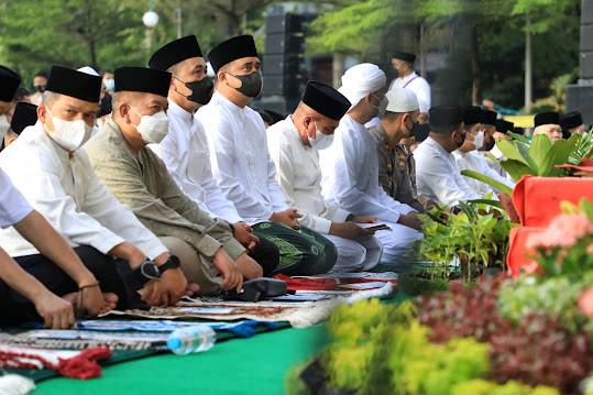 MEDAN, PILAREMPAT.com - Wali Kota Medan Bobby Nasution bersama Ketua TP PKK Ny Kahiyang Ayu Bobby Nasution dan ribuan masyarakat Kota Medan melaksanakan Shalat Idul Fitri 1 Syawal 1443 H di Lapangan Merdeka, Senin (2/5/2022). Bertindak sebagai imam Shalat Idul Fitri, Qori Internasional Al Ustadz H Jakfar Hasibuan dengan Khatib Al Ustad Hasan Matsum (Ketua Umum MUI Kota Medan)